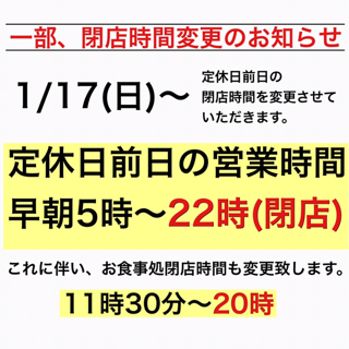 月曜日祝日の場合、火曜日が定休日となるため、月曜日の閉店時間が22時になります。