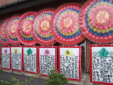 海王の建物正面に花輪が6本飾ってあります。